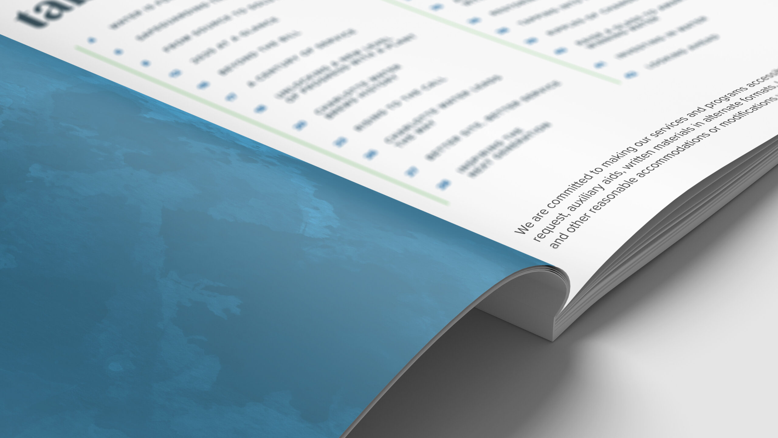 We’re not lawyers, and we don’t take on legal compliance responsibility on behalf of our clients. But we do bring the knowledge, process and design sensibility to help public entities produce materials that reflect ADA conformity principles as closely as the medium allows.